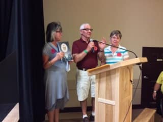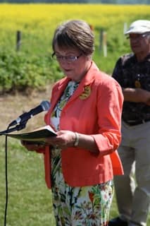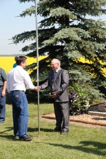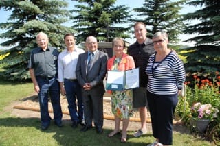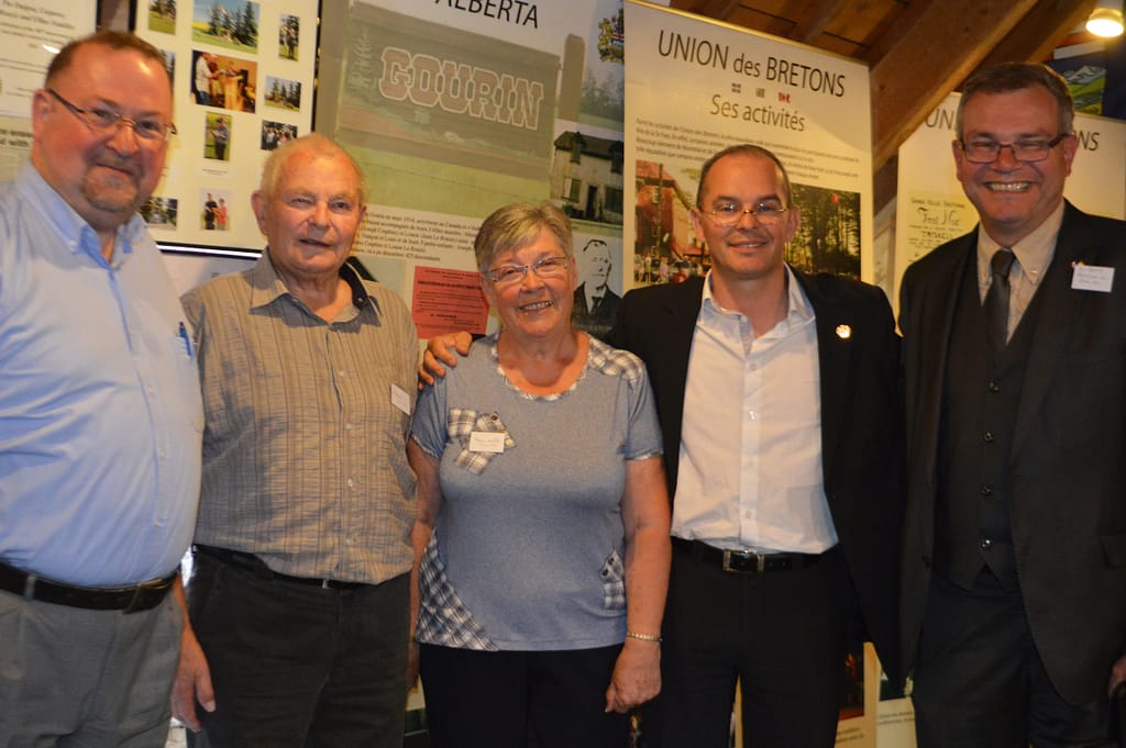 Lors de la cérémonie des 100 ans de Gourin-City. De gauche à droite : Sylvère Ulliac, Shayn Saskiw (Gouvernement provincial de l’Alberta), Fernand Ulliac et Marie-Rose Royer (descendants des pionniers de Gourin-City), Edmond Le Rouzic, Marie-Noëlle Ulliac (représentante de la Bretagne).