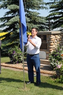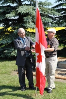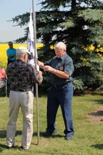 Levées des 3 drapeaux (Bretagne, Alberta et Canada) lors du weekend du centenaire des familles Ulliac, Duigou, Cospérec et Le Rouzic, les 11, 12 et 13 juillet à Gourin (Alberta)