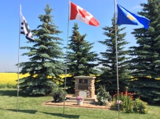 1914: Marie-Louise Ulliac (née Cospérec) venait prier ici pour que ses fils n’aillent pas à la Guerre… 2014: Les drapeaux breton, d’Alberta et du Canada flottent à jamais à Gourin-City en Alberta (Canada)