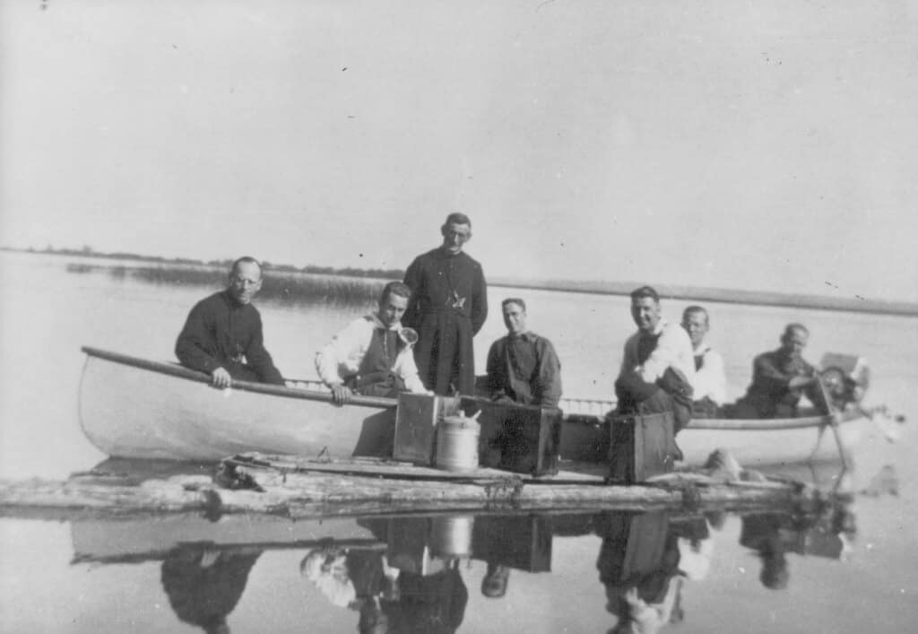 Joseph Le Treste né en 1861 à Arradon (56), arrivé au Canada en 1883. Prend sa retraite à Fort Mac Murray en 1942, meurt le 5 décembre 1955 à Fort Smith. Au début, ses interventions se faisaient en traineau à neige puis il eut une passion pour les véhicules automobiles et aéroportés… Photo 1: « Au retour de visites à mes postes entre Fort McMurray et Edmonton. JLT ». Photo 2: « Au débarcadère des avions, au bord de la rivière Eau Claire, accompagnant le père Jean-Louis Coudert, sur son départ pour la mission du lac Athabasca (Chipewyan). JLT ». Fort McMurray, pilote Louis Bisson. Vers 1930-1935. Photos personnelles du père Joseph Le Treste.