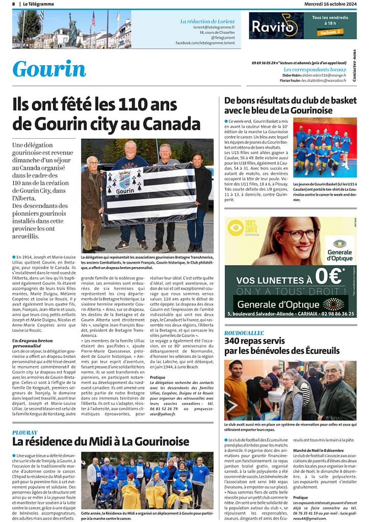 Une délégation Gourinoise s’est rendue, début octobre, au Canada, à l’occasion des 110 ans de la création de Gourin City. Ils ont été accueillis par les descendants des pionniers Gourinois qui se sont installés dans la province de l’Alberta.