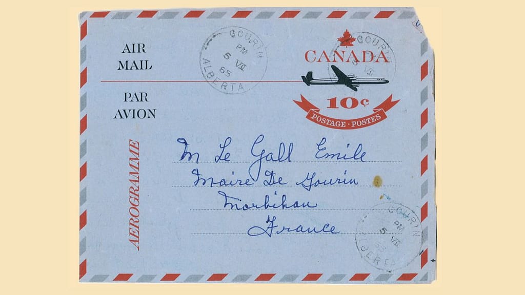 Lettre extraite du panneau de Bretagne Transamerica à l’exposition « Ces Bretons d’Amérique » au Chateau de Tronjoly à Gourin. On y distingue les tampon de la poste de Gourin Alberta.